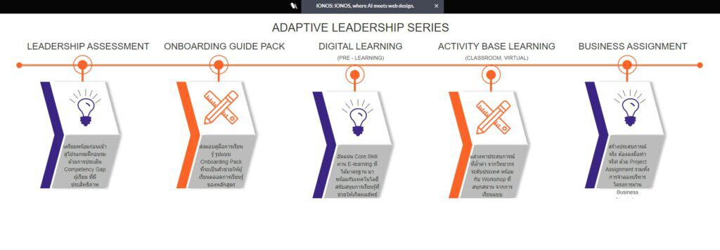 Soft SQ ออกแบบแผนพัฒนา Adaptive Leadership Series เพื่อพัฒนาทักษะจำเป็นสำหรับผู้นำยุคใหม่ (Adaptive Leadership) ที่เน้นการเรียนรู้ ฝึกฝน ควบคู่ไปกับการลงมือทำจริง ตามแผนทฤษฎี 10 : 20 : 70 ที่เห็นผลลัพธ์ ทั้งนี้เพื่อสร้างพนักงาน แต่ละระดับให้กลายเป็นผู้นำยุคใหม่ ที่สามารถปรับตัวรับความเปลี่ยนแปลงทางโลกธุรกิจ พร้อมทั้งสร้างความน่าเชื่อถือ (Trust) และสอนงาน (Coaching) ให้ลูกทีมได้ โดยแผนการพัฒนาบุคลากรนี้ ครอบคลุมตั้งแต่ Frontline Leader ไปจนถึง Manager Level